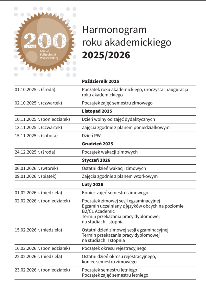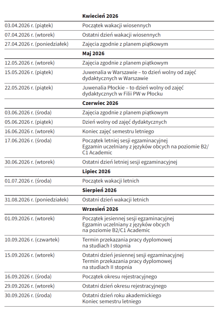Harmonogram Roku Akademickiego Instytut Elektroenergetyki > Kształcenie > Harmonogram Roku Akademickiego Harmonogram roku akademickiego 2025/2026 Co znajdziesz w dziale Kształcenie: Harmonogram Roku Akademickiego Projekt Omnis Studia Inżynierskie Studia Magisterskie Studia Podyplomowe Zasady Rekrutacji Zarządzenie nr 29 Rektora Politechniki Warszawskiej z dnia 14 maja 2025 r. Zajęcia W semestrze letnim w dniu 27 kwietnia 2026 r. (poniedziałek) odbędą się zajęcia zgodnie z planem zajęć w piątek w dniu 12 maja 2026 r. (wtorek) odbędą się zajęcia zgodnie z planem zajęć w piątek w dniu 3 czerwca 2026 r. (środa) odbędą się zajęcia zgodnie z planem zajęć w piątek. Więcej